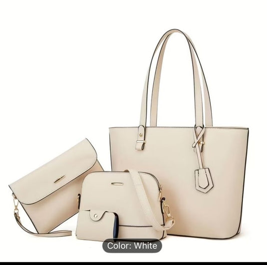Set of handbags including a tote, satchel, and clutch on a white background.